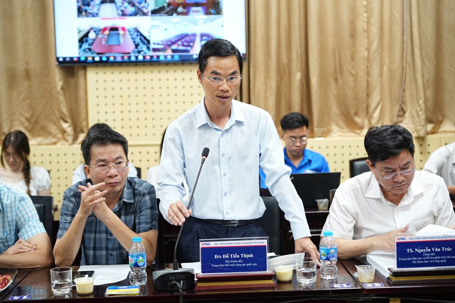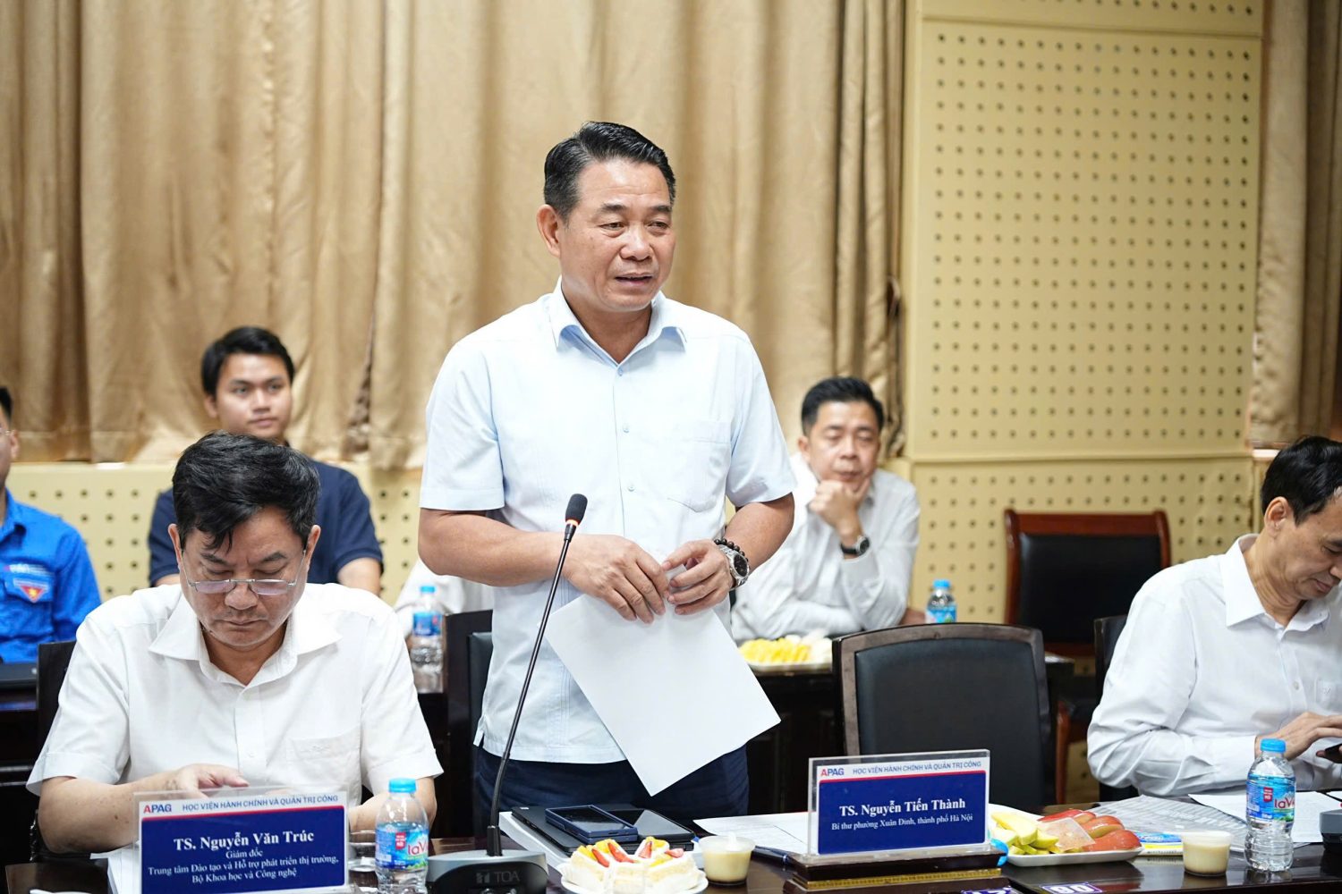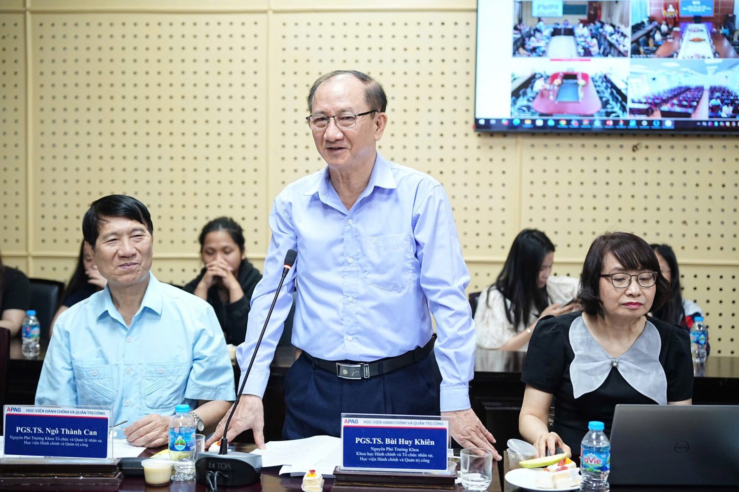 Đại biểu, khách mời dự Hội thảo, có: TS. Bùi Phương Đình, Phó Giám đốc Học viện Hành chính và Quản trị công; TS. Nguyễn Tiến Thành, Bí thư phường Xuân Đỉnh, thành phố Hà Nội; ông Đỗ Tiến Thịnh, Phó Giám đốc xu hướng, thách thức và giải pháp; TS. Nguyễn Văn Trúc, Giám đốc Trung tâm Đào tạo và Hỗ trợ phát triển thị trường, Bộ Khoa học và Công nghệ; TS. Nguyễn Thanh Bình, Trưởng khoa Lãnh đạo Học và Hành chính công, Học viện Chính trị Khu vực I cùng đông đảo các nhà khoa học, giảng viên trong và ngoài Học viện.