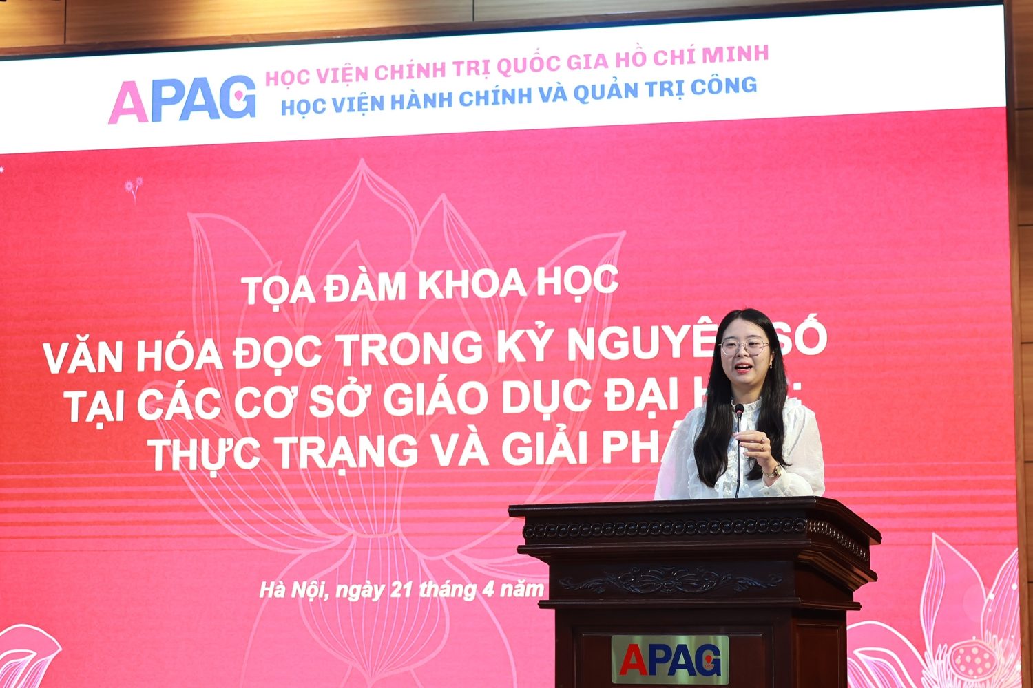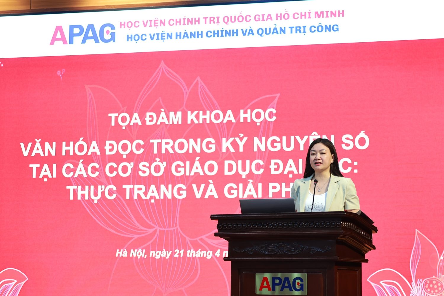 Bàn về các giải pháp phát triển văn hóa đọc của sinh viên trong kỷ nguyên số, TS. Vũ Dương Thúy Ngà chỉ ra rằng, dù công nghệ mở ra kho tàng tri thức khổng lồ nhưng cũng gây ra nhiều hệ lụy về lối “đọc nông”, đọc phân mảnh và sự lệ thuộc vào các nội dung rút gọn trên mạng xã hội. Để khắc phục tình trạng này, bà nhấn mạnh vai trò chủ động của sinh viên trong việc rèn luyện tư duy phản biện và kỹ năng thẩm định thông tin, thay vì chỉ tiếp nhận thụ động; đồng thời, bà đề cao trách nhiệm của nhà trường trong việc đổi mới phương pháp dạy học gắn liền với yêu cầu đọc học thuật, cũng như việc hiện đại hóa thư viện thành các trung tâm tri thức số chuẩn mực, coi công nghệ như một công cụ hỗ trợ đắc lực chứ không phải rào cản nhằm xây dựng một thế hệ người đọc biết cân bằng giữa sự tiện lợi của kỹ thuật số và chiều sâu của tri thức truyền thống.