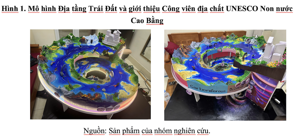 Mô hình “Địa tầng Trái Đất và giới thiệu Công viên địa chất toàn cầu UNESCO non nước Cao Bằng” được học sinh THCS tự thiết kế và chế tạo dưới dạng xoắn ốc ba chiều, tái hiện các thời kỳ địa chất chính và giá trị tiêu biểu của công viên. Sản phẩm sử dụng vật liệu phổ thông (fomex, đất nặn, màu vẽ) kết hợp linh kiện điện tử cơ bản và lập trình Arduino để điều khiển ánh sáng LED và âm thanh song ngữ. Tổng chi phí khoảng 1,2 – 1,5 triệu đồng. Đây là đóng góp mới của nghiên cứu trong việc đề xuất một mô hình quản trị giáo dục STEAM phù hợp với bối cảnh vùng khó khăn thông qua khai thác tài nguyên di sản địa phương.