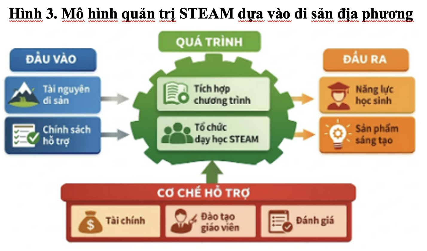 Từ kết quả phân tích thực trạng và các rào cản trong triển khai giáo dục STEAM tại vùng khó khăn, nghiên cứu đề xuất mô hình quản lý giáo dục STEAM dựa vào khai thác di sản địa phương như một giải pháp tích hợp nhằm nâng cao hiệu quả thực thi chính sách (xem Hình 3).